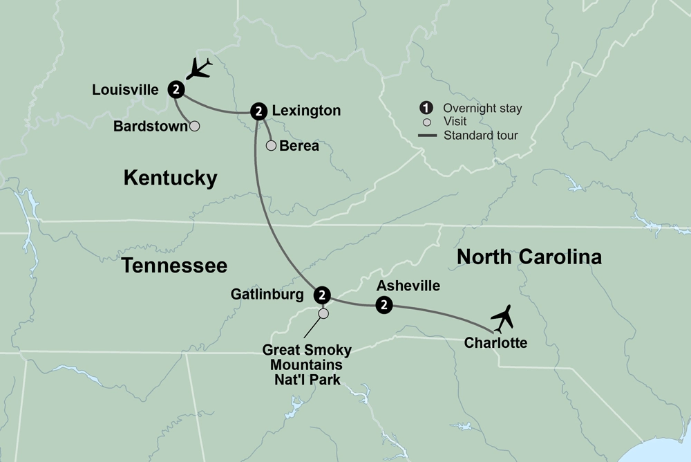 Take a delightful trip through the heart of Appalachia, discovering the equestrian culture of Kentucky, the pioneer spirit of Tennessee, and the mountainous beauty of North Carolina. Get a taste of the spirit of Kentucky through Louisville and Lexington, where bourbon flows, baseball legends are born, and Thoroughbreds reign supreme. Travel through Daniel Boone National Forest as you make your way to Gatlinburg, Tennessee. From your home base of Gatlinburg, explore the natural wonders of Great Smoky Mountains National Park. Travel on to Asheville, North Carolina, and enjoy the city’s historic architecture, engaging neighborhoods and robust arts districts. Tour the Biltmore Estate, George Vanderbilt’s "little mountain escape” in the Blue Ridge Mountains. When you leave, you’ll have the warmth and charm of southern Appalachia still in your heart.