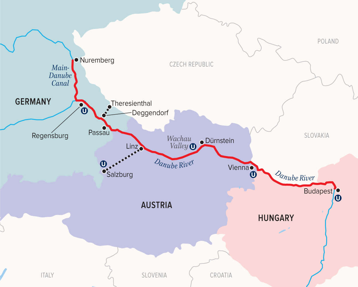The mighty Danube takes you through three nations decked in all their holiday finery at this most delightful time of year. On Christmas Eve, walk through the quiet medieval streets of Regensburg to the Gothic cathedral for Midnight Mass. Ring in the New Year dancing in a real Viennese palace, and see how a dusting of snow adds to the glamour of Hungary’s historic capital.